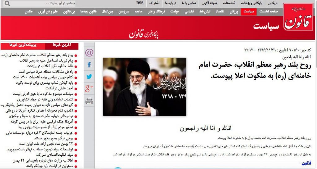 تداول ناشطون إيرانيون عبر مواقع التواصل خبراً عن إغلاق موقع صحيفة "القانون" بعد دقائق فقط من نشره خبراً عاجلاً يفيد بوفاة المرشد الأعلى للنظام الإيراني علي خامنئي.