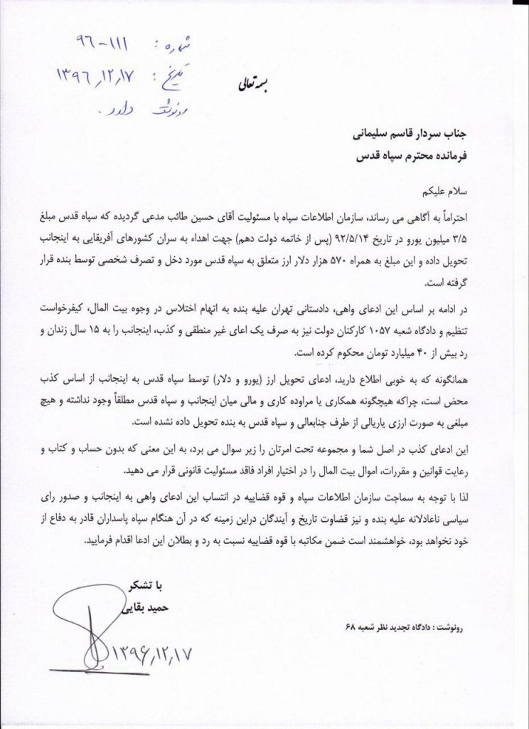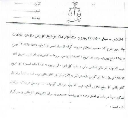 صورة عن حكم المحكمة حول اتهام بقائي بسرقة الملايين من اموال الحرس الثوري المخصصة لافريقيا[/caption]
