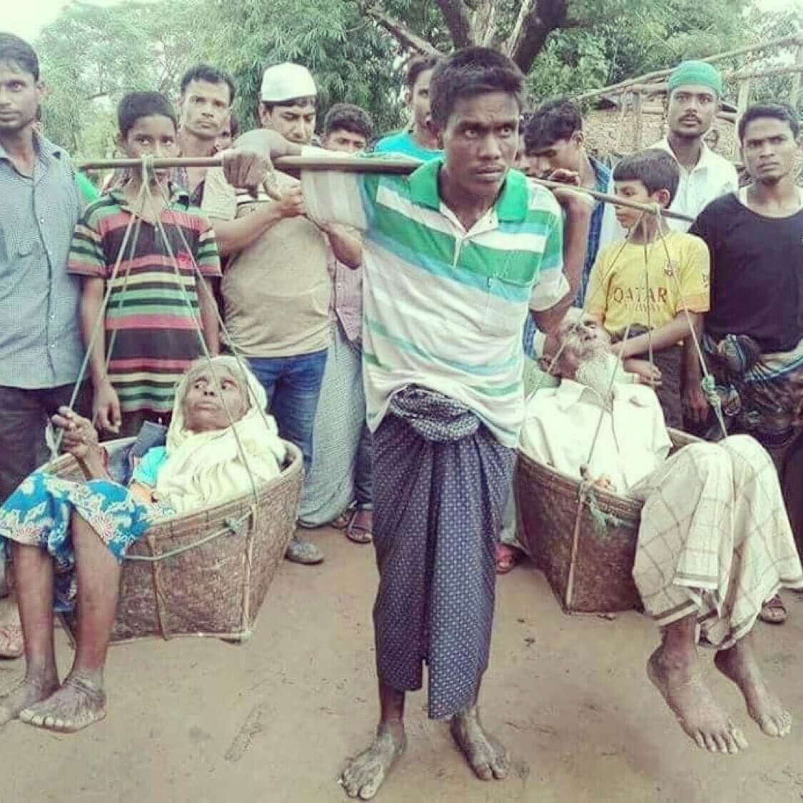 صورة وتعليق|نازح روهنغي مسلم يحمل والديه المسنّين على ظهره ويمشي عدة أيام لينقذ حياتهما من إرهاب جيش ميانمار والمليشيات البوذية
